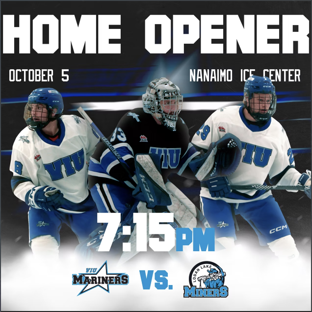 The VIU Mariners lead us to victory in a nail-biting match this past Saturday, October 5th, at Nanaimo Ice Centre in our home opener game sponsored by Nanaimo Mitsubishi. Mariners went head-to-head with the Logan Lake Miners and left the 325 fans sitting on the edge of their seats.